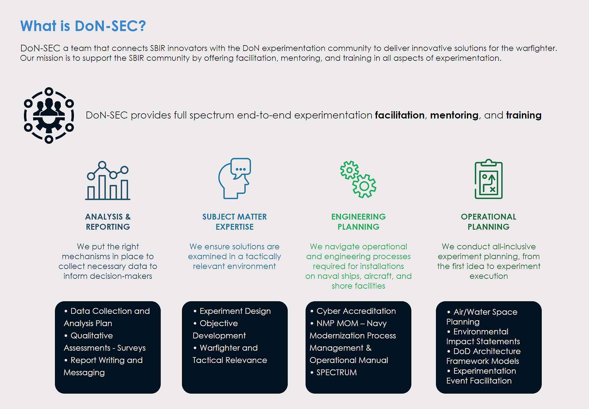 The SIC is a collaborative team focused on navigating experimentation planning processes and informing the SBIR/STTR community through interactive Learning Labs. Please stay tuned to the DoN-SEC LinkedIn for individual Learning Lab announcements.- DoN-SEC Helps Small Companies Engage with Experimentation